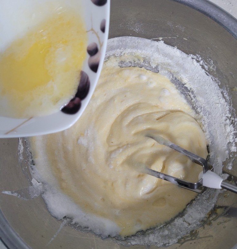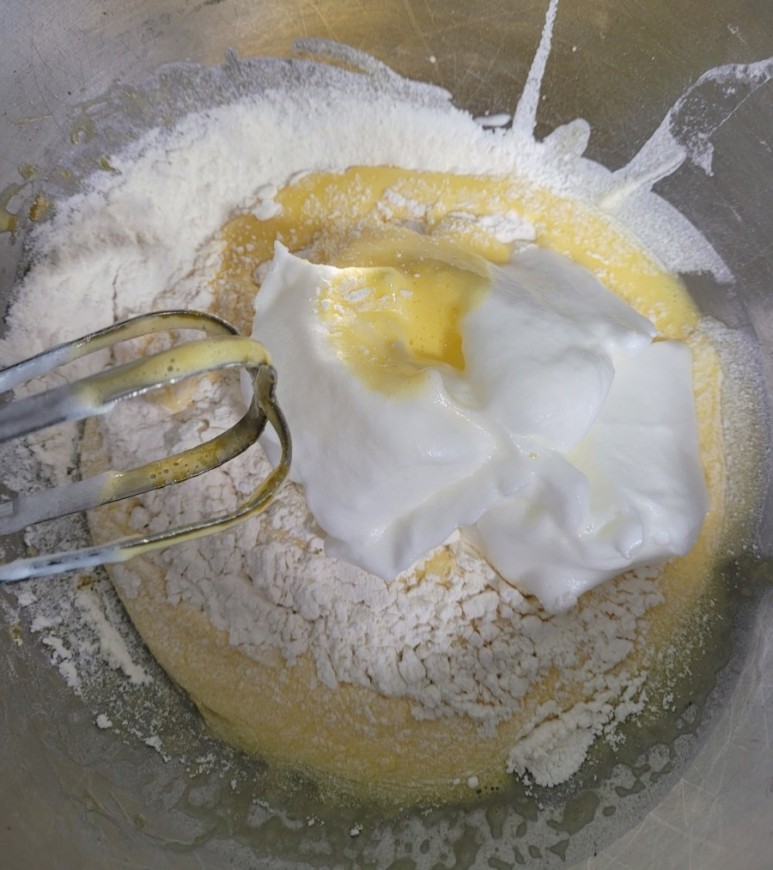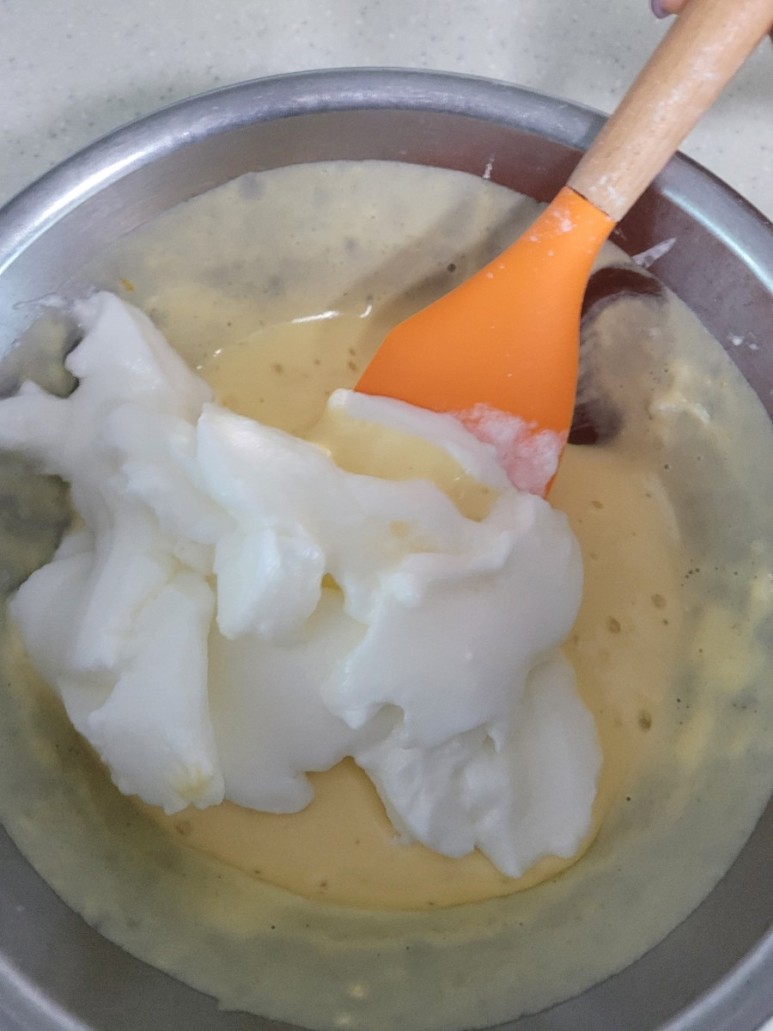 4. 머랭 1/3 + 밀가루 + 우유&버터 넣기