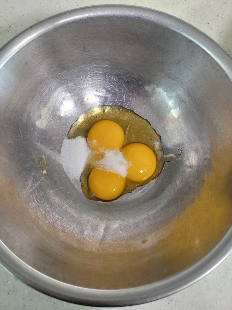 노른자 반죽 : 노른자 3알, 설탕 8g, 꿀 15g, 박력분 or 중력분 40g, 우유 20g, 버터 8g
