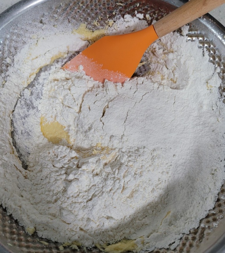 7. 가루를 체 쳐서 반죽에 넣어주세요.