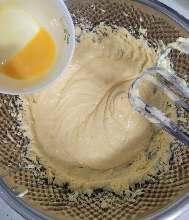 생크림 파운드케이크용 달걀은 차가워도 되지만, 유자 파운드케이크용은 미지근해야 합니다. 버터와 분리되면...OMG